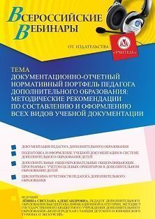 Вебинар Документационно-отчетный нормативный портфель педагога дополнительного образования: методические рекомендации по составлению и оформлению всех видов учебной документации