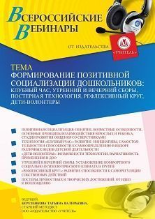 Вебинар Формирование позитивной социализации дошкольников: клубный час, утренний и вечерний сборы, постерная технология, рефлексивный круг, дети-волонтеры