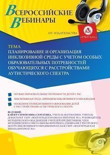Вебинар Планирование и организация инклюзивной среды с учетом особых образовательных потребностей обучающихся с расстройствами аутистического спектра